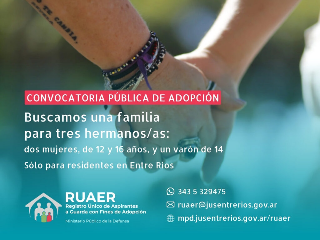 Se trata de una convocatoria pública con el objetivo de lograr la adopción de estos tres hermanos que desean egresar de la institución donde se alojan actualmente y permanecer juntos. “Es un proceso que se da luego de haber agotado las posibilidades entre los postulantes que están inscriptos en el Registro de la provincia de Entre Ríos y en la red federal conformada por todos los registros del país, sin haber podido hallar una familia que cuente con los recursos y las herramientas necesarias para alojarlos por la vía adoptiva”, explicó la secretaria del RUAER, María Spais.